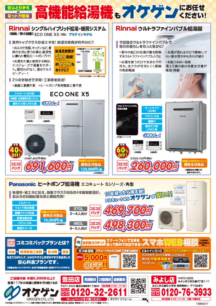 このチラシには、オケゲンのおすすめするおトクな給湯器を掲載していますので、ぜひ参考にしてみてください。