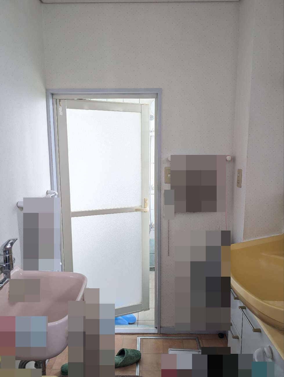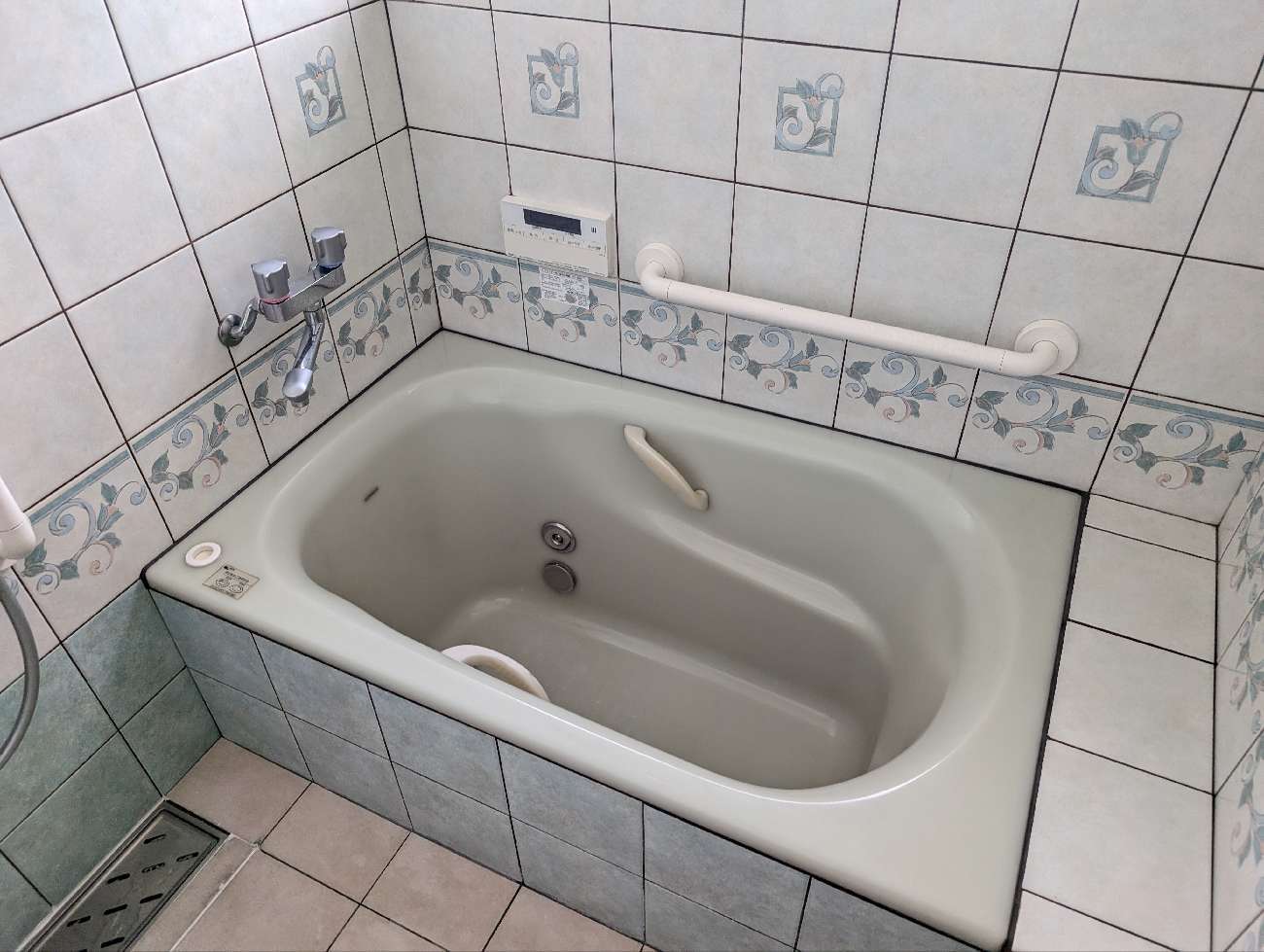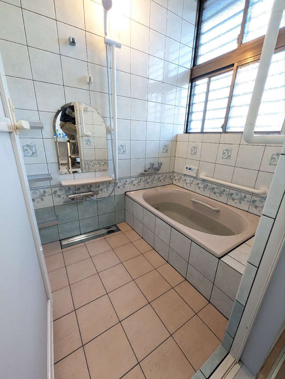 当初ユニットバスへの取替も検討していましたが、⼤きな窓やちょうどいいサイズのお⾵呂が無い為、浴槽と床のタイルの張替となりました。