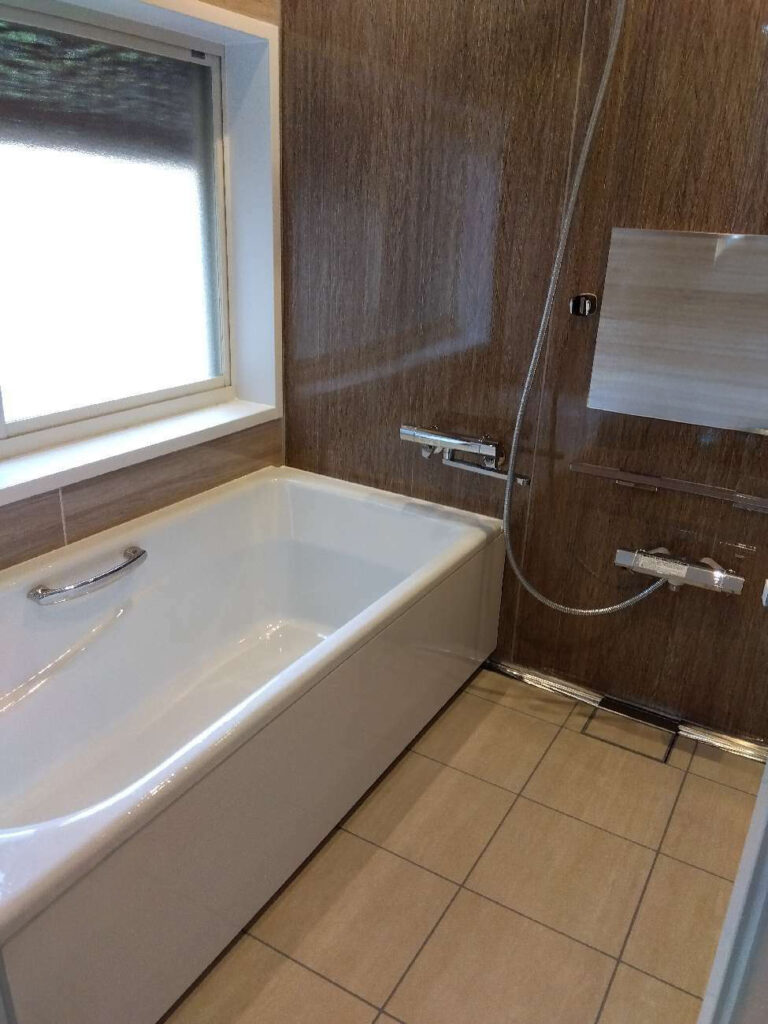 浴槽にひび割れができてしまった為、リフォームしたいとのお問合せでした。⾜が悪いお⺟様の為に安全に快適にお⾵呂に⼊れるようにしたい。