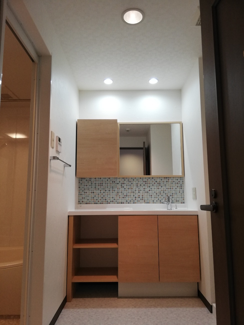 脱衣場はタイル柄のモザイクシートを使用、洗面台とマッチしてお洒落な空間に!