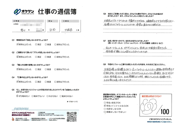 お風呂場の浴槽をなくし、広いシャワールームにしたい(老後の生活を考えて介助しやすく、そうじも楽ちん)。カタログにはのっていない希望をすべて叶えてくれた担当者さんにとても感謝しています。職人さんたちにも信頼できる、とても感じの良い方たちでした。