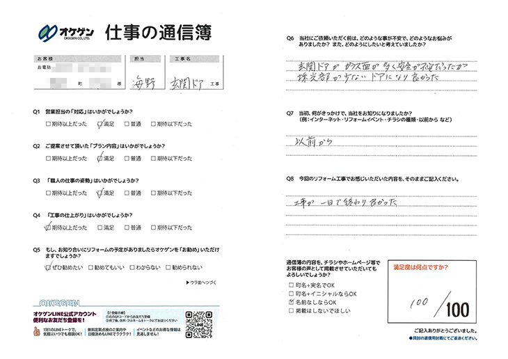 オケゲンでのリフォームありがとうございます! 満点評価をいただき、とても感謝しております。 次回のお声掛け、スタッフ一同 楽しみにお待ちしています。 今後とも、長いお付き合いができますよう、 どうぞよろしくお願いいたします。