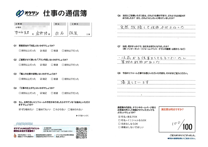 オケゲンでのリフォームありがとうございました! 高得点をいただき、大変感激しております。 今後も、お客様のご期待を裏切らないよう努力して参ります。 どうぞよろしくお願い致します。