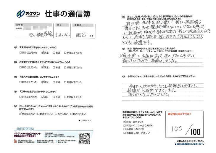 「以前、他のリフォームもやって頂いたのでお願いしました。」と満点評価いただきました!