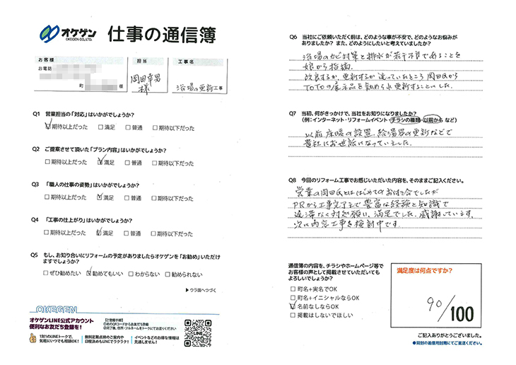 営業の岡田氏とは、はじめてのお付き合いでしたが、PRから工事完了まで豊富な経験と知識で遅滞なく対処願い、満足でした。感謝しています。
